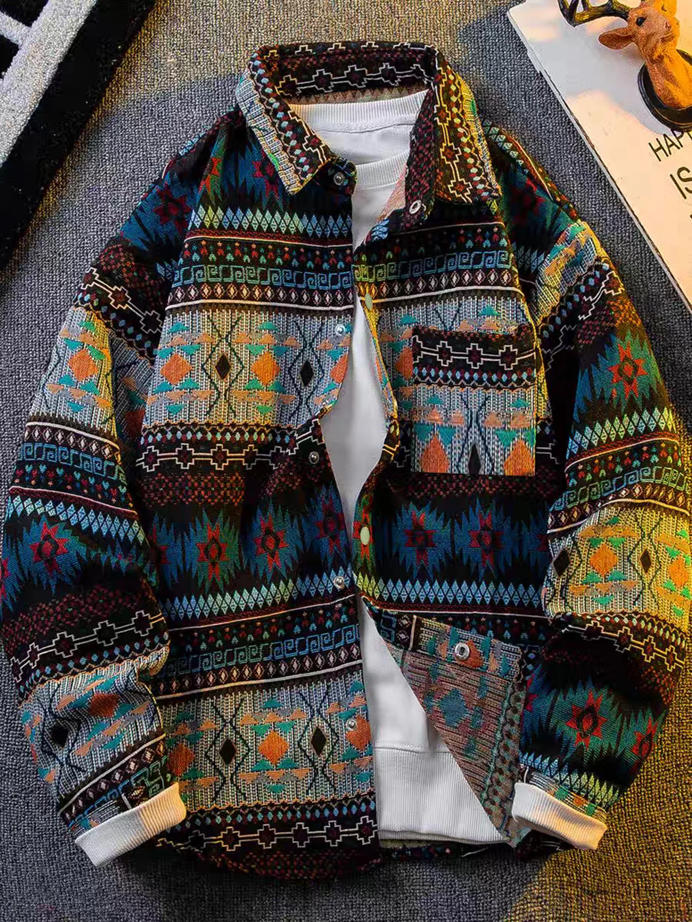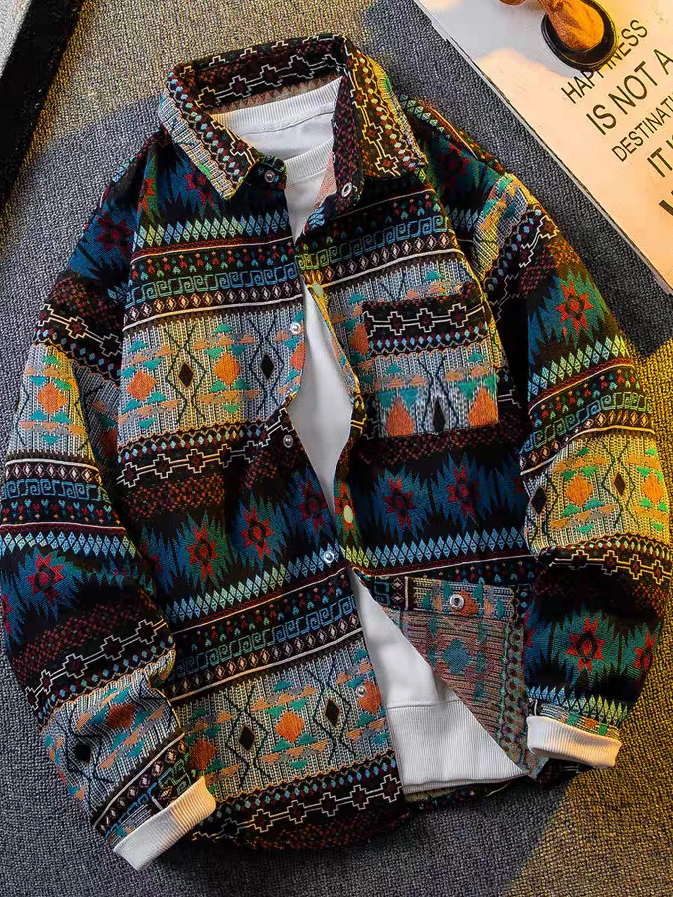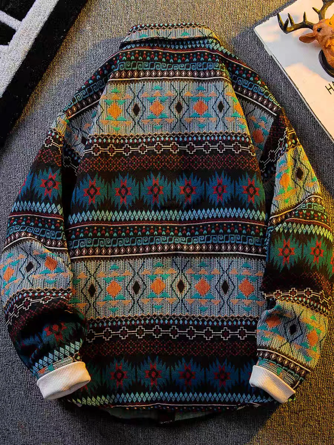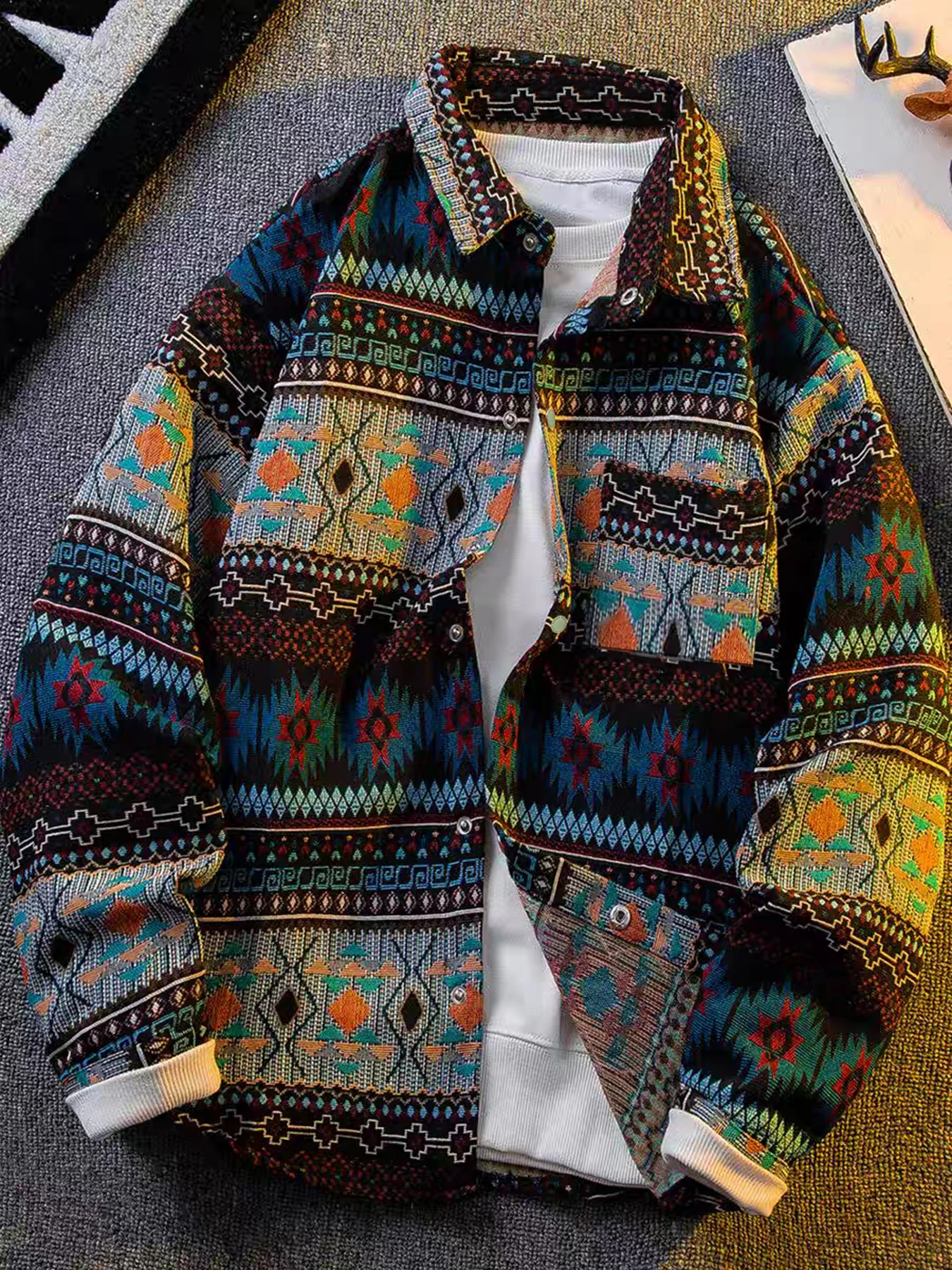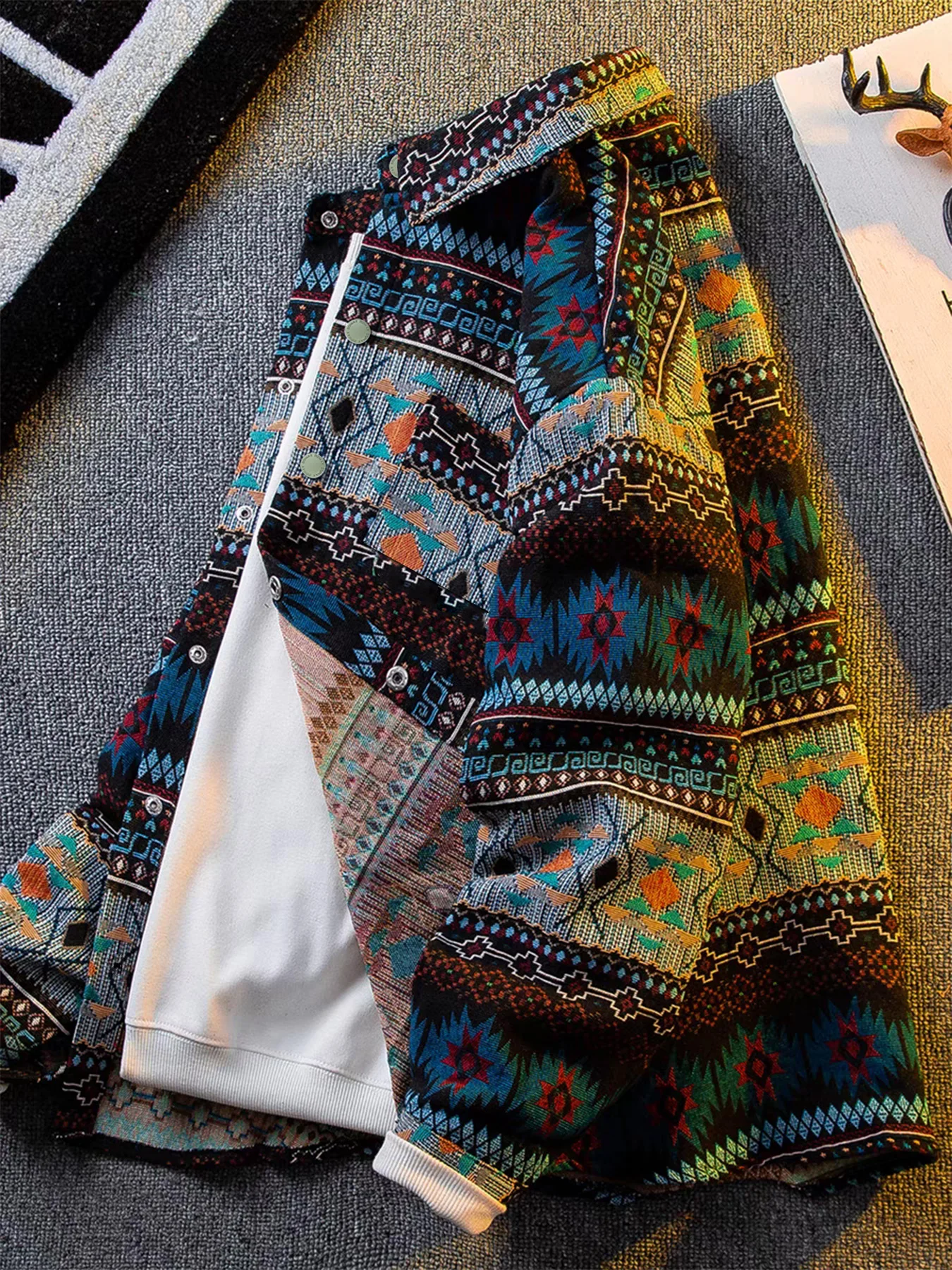 American retro, Native American-inspired, artisanal embroidery, reversible collar, jacket/outerwear.